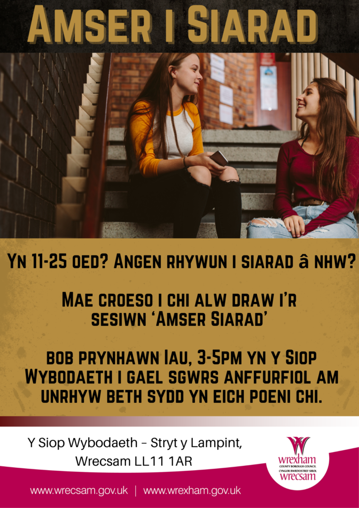 Mae croeso i chi alw draw i’r sesiwn ‘Amser Siarad’ bob prynhawn Iau, 3-5pm yn y Siop Wybodaeth i gael sgwrs anffurfiol am unrhyw beth sydd yn eich poeni chi. Edrychwn ymlaen at gael cwrdd â chi.