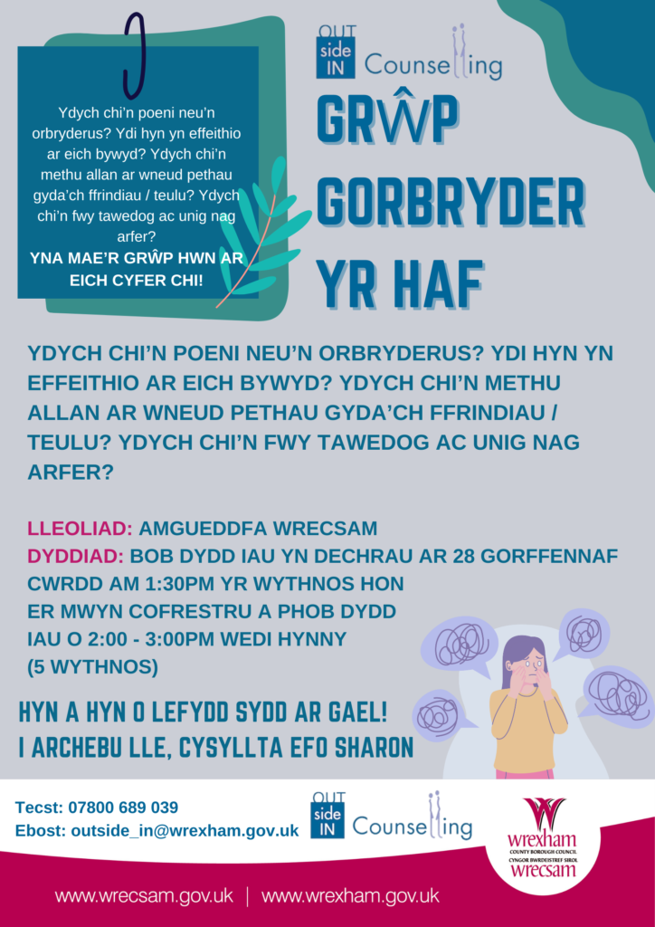 Byddwn yn eich helpu i ddeall eich gorbryder, canfod ffyrdd i reoli’r emosiynau hynny a’ch helpu i ddysgu rhai strategaethau a thechnegau i ymdopi. Bob dydd Iau yn dechrau ar 28 Gorffennaf. Cwrdd am 1:30pm yr wythnos hon er mwyn cofrestru a phob dydd Iau o 2-3pm wedi hynny.