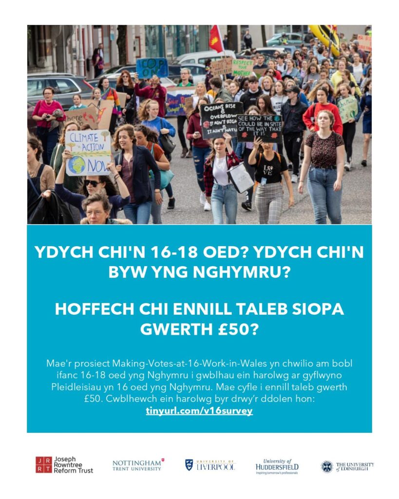 Mae’r prosiect Making Votes-at-16 work in Wales am glywed barn pobl ifanc 16-18 oed am eu profiadau o etholiadau diweddar Cymru. Mae’r prosiect yn cael ei gynnal gan ymchwilwyr ym Mhrifysgolion Nottingham Trent, Lerpwl a Huddersfield gan weithio gyda Llywodraeth Cymru i sicrhau bod barn pobl ifanc yn cael ei chlywed yn etholiadau Cymru. Rydym am glywed barn pob person ifanc, p’un a wnaethoch chi bleidleisio yn yr etholiad ai peidio. Mae ein harolwg byr https://tinyurl.com/v16survey Dim ond 10-15 munud y dylai ei gymryd i chi ei gwblhau ac mae cyfle i chi ennill un o’n deg taleb £50 drwy gymryd rhan yn y gystadleuaeth ar ddiwedd yr arolwg.