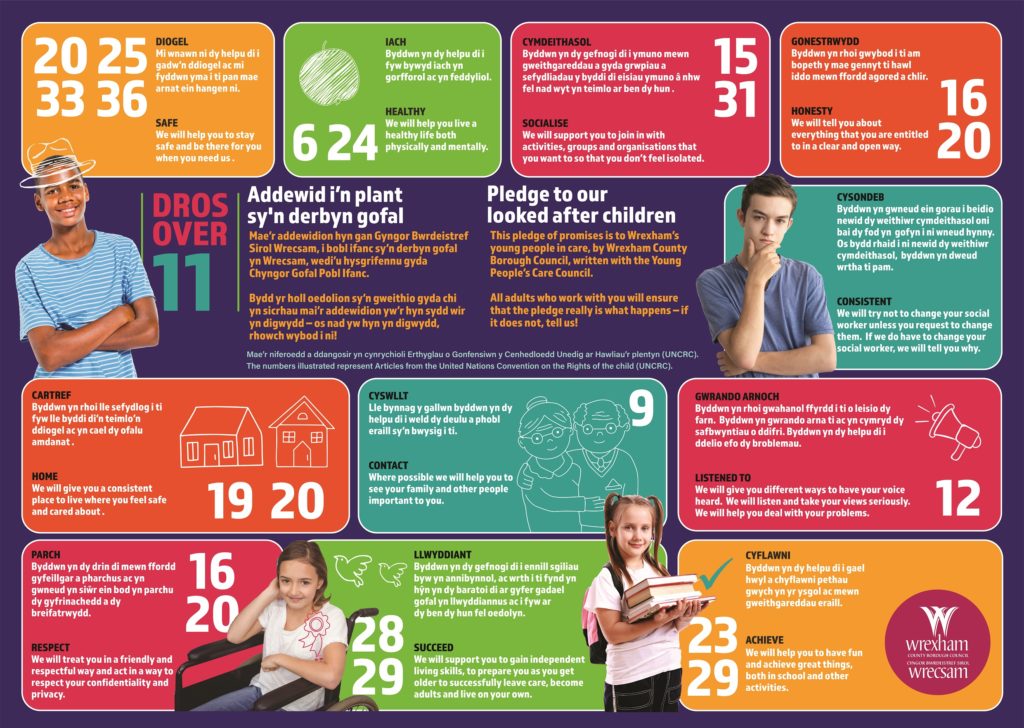 Our Pledge to Children and Young People in Care is a set of promises made by Wrexham Borough Council in partnership with other services to all of our looked after children and care leavers. All adults who work for and with Wrexham Council share a responsibility for helping looked after children to stay safe and healthy, enjoy life, and achieve their goals. Our pledge comes in two versions one for 11 and under and one for over 11’s. As part of ensuring that Children’s Rights are met, articles that link to the pledge are listed within the Pledge.